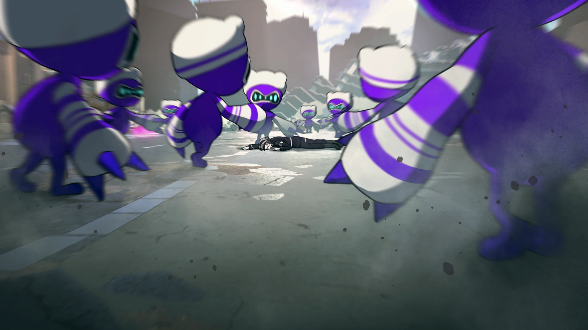 As the last of the nightlights switch off and are replaced the colossal light panels on the ceiling that stretch from one horizon to the other, an administrative announcement from the Tokyo Residential Complex authorities announces the start of a new day over the omni-present loudspeakers. Most of the complex's residents are already heading to their destinations for the day, but not Takumi Sumino. He has just switched off his alarm clock and is thinking of sleeping in, but his mother calls him to breakfast. Thus, Takumi begrudgingly heads to the kitchen to start his new day. After learning his father has already headed out, Takumi sees a familiar sight at the dining table. His longtime childhood friend, Karua Kashimiya, is having breakfast at the same table, which Takumi finds a little odd. Remembering Karua's mother is frequently absent from home for her research, both Takumi and his mother welcome her to visit anytime, which Karua accepts with gratitude. Takumi and Karua chat while heading to school. After breakfast, the two head to school. They discuss an upcoming exam and whether they should have a study session together. While Takumi is reluctant about anything related to studying, Karua convinces him that, no matter what, he can and will always find a way to succeed. Takumi's resolve is bolstered by this quote, and the pair continue their walk toward their school. The endless flow of peaceful and quiet days in the complex are all so taken for granted. But then, the complex's alarm klaxons suddenly activate and warn the residents of an attack on the complex. All residents are directed toward the complex's many underground bunkers to seek shelter until the emergency situation is over. Apparently, Takumi has heard these alarms so often that it is more of a nuisance than an emergency, but it is more distressing for Karua, as the wailing of sirens reminds her of the time her father died. Takumi sees a manhole cover before him and suggests they head into the shelter below. He removes the cover and climbs down the ladder with Karua. While the two wait for the emergency to end, Takumi realizes they are the only two in this particular shelter. The alarms and seeking shelter underground have also become ingrained into the daily life of the complex, even though none of its citizens know the meaning behind any of it. Despite Takumi's reassurances, Karua is still nervous and asks Takumi to repeat a particular phrase he once said to her. Under "pressure," Takumi acquiesces and utters the phrase, promising to protect Karua no matter what happens. In reaction, Karua leans into his arm, and it gets Takumi quite flustered. The two climb out of the hideout. Takumi arrives at the abandoned school. Sometime later, the administrative announcement gives the all clear signal and disengages the emergency protocols. Like Takumi said, nothing has happened to the complex during the alarms. The two ascend the stairs and prepare to continue their trip to school. Just as Takumi removes the manhole cover to get out, a shiba inu suddenly appears at the entrance. This startles Takumi enough for him to fall and roll all the way down the ladder and stairs he has just climbed. Like a miracle, Takumi is not injured at all, but Karua suddenly ditches him to chase after the fleeing dog. Takumi calls out to Karua and, after seeing her running not far in front of him, chases after her. The chase leads him through several narrow alleyways, and, after running through the final one, Takumi comes upon an abandoned school building, one he never knew is even there. Then, he sees Karua running through its corridors and enters the building to find her. After ascending a floor, Takumi enters a classroom and finds the dog Karua is chasing, although she is not there. However, the dog suddenly jumps at his face and explodes into smoke. By the time the smoke clears, Takumi is sitting against the wall and looking at a newcomer, Sirei. Takumi cannot make out if this newcomer is a robot or a toy. Apparently, that dog Karua was chasing is Sirei in disguise. Sirei is here to recruit Takumi for something and, without much delay, hands him a reddish blade with Takumi's full name inscribed on it. Before Takumi can even take it, Sirei instructs him to stab the blade into his heart. Takumi struggles to comprehend this absurdity, but the alarms outside suddenly start wailing again, this time warning of something much worse. Hearing the alarms, Sirei muses that the peaceful days in the complex have finally come to an end. Takumi wants nothing to do with Sirei's increasingly assertive recruiting and rapidly flees the classroom without the gifted infusion blade. Outside, Takumi unexpectedly runs into Karua, who strongly feels that this alarm is different from all the preceding ones. Before Takumi can calm her down again, the ceiling suddenly collapses. Its debris lands behind the two and reveals a trio of Grizzlei within. Once the Grizzlei spot the two, they immediately attack, and the two flee. Despite the alarm, the attackers have caught many citizens off guard and are massacring them, completely devastating the complex as they go. Takumi and Karua rush past the slaughter, seeking a way out of literal chaos. When the two run up a bridge to flee, they see the trio of Grizzlei from just then approaching via the other side. The bridge gets destroyed when they try going back the way they came, and the two fall down to the road below. After coming by, Takumi sees that the unconscious Karua is surrounded by the mysterious invaders, and he himself is too far to reach or save her. Sirei pops up out of nowhere and continues their unfinished conversation, now with much more weight behind his words. He tells Takumi that, to save Karua, he will have to stab the blade he left into his heart, just like he has told him before. To inject the power within the blade into his heart means gaining the power to fight the invaders. At the same time, it can act as a "tra